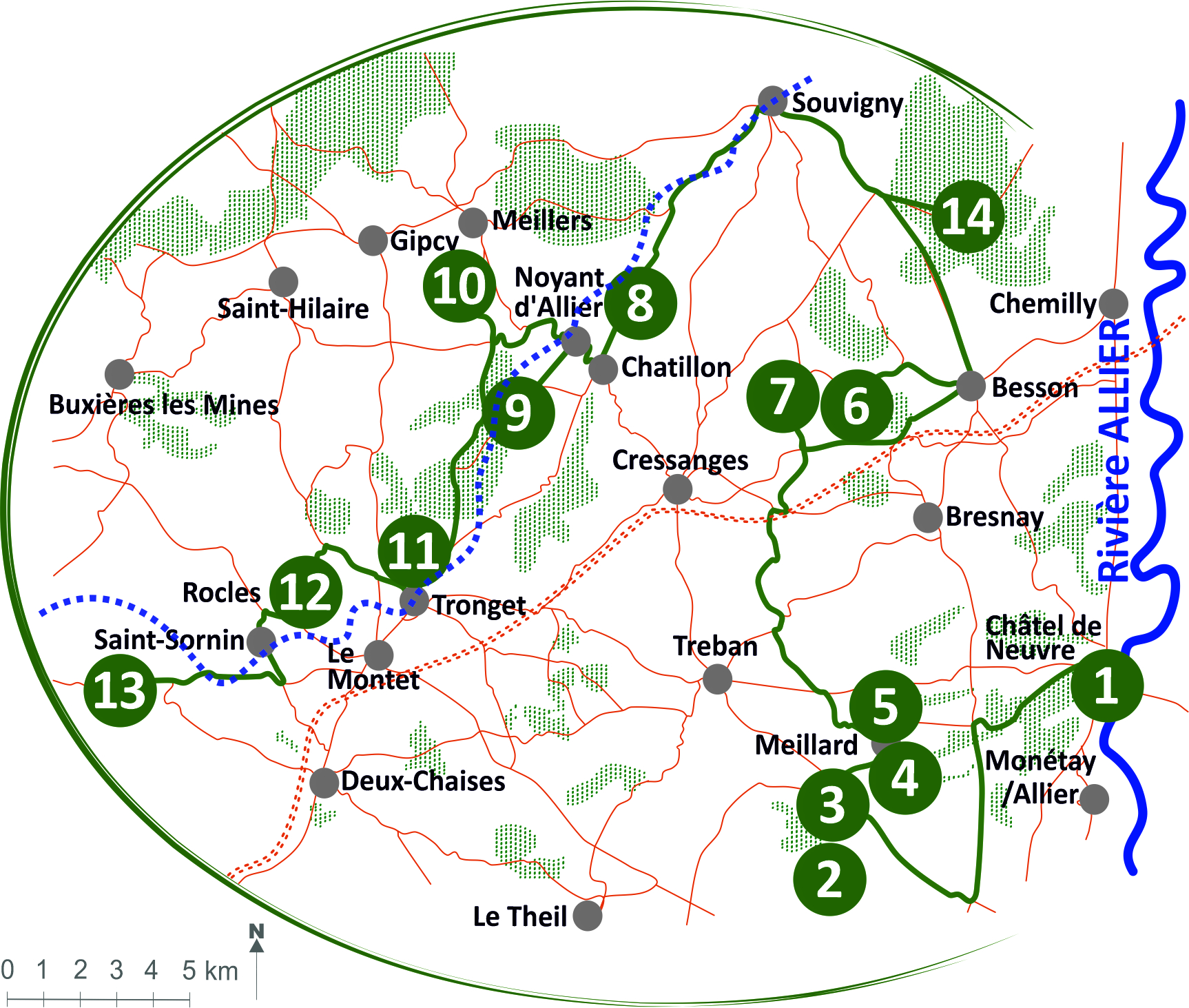 - CHATEL de NEUVRE : Place de l’église (présentation de l’itinéraire) – stèle au Pont sur l’Allier, détruit dans la débâcle.