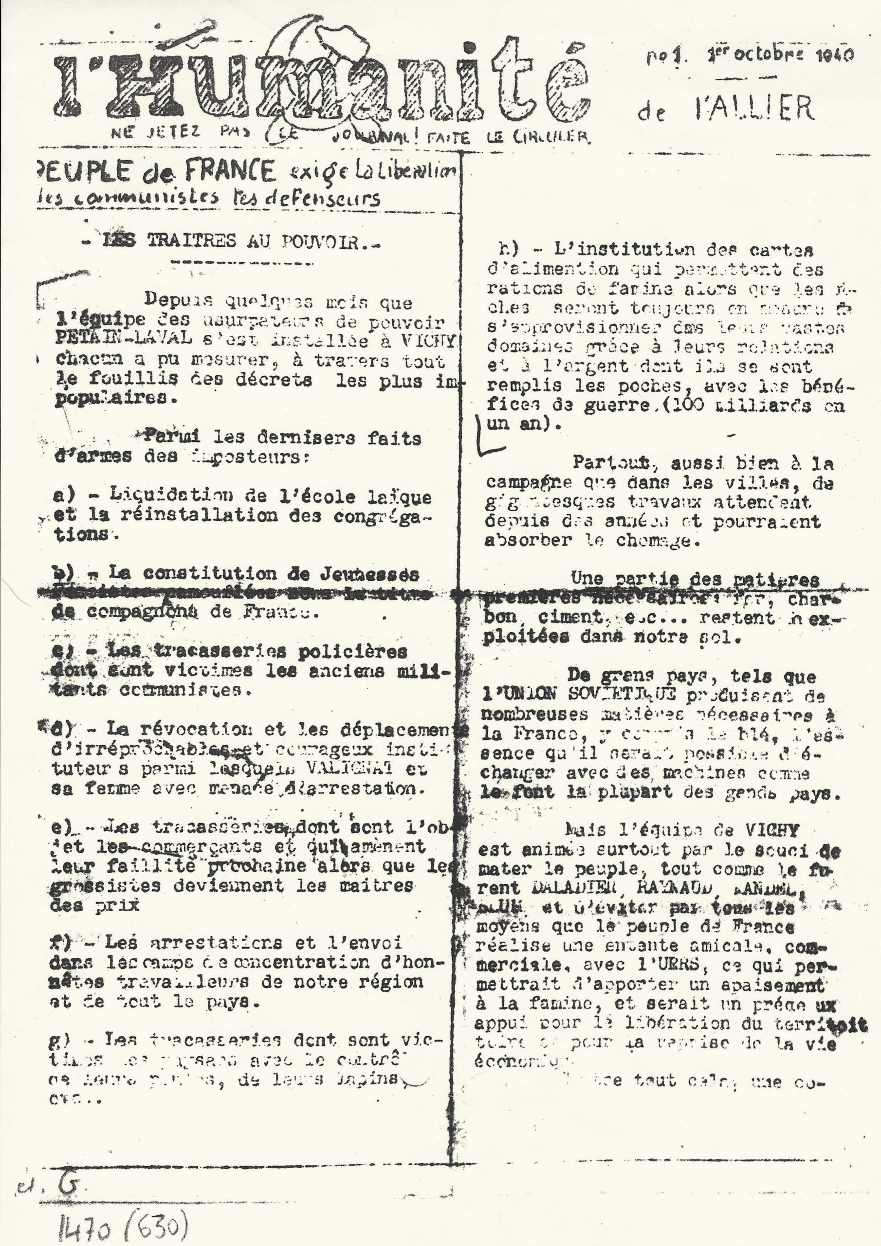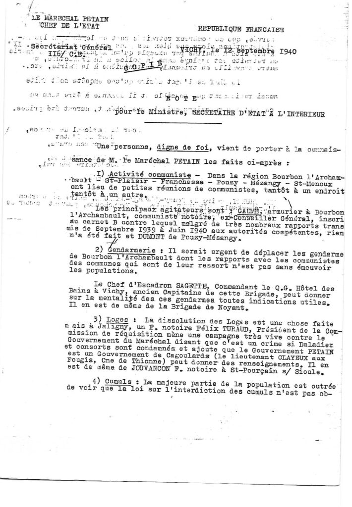 Parmi les éléments qui témoignent de l’engagement précoce des communistes français dans la Résistance, l’appel du 17 juin 1940, lancé par Charles TILLON depuis Bordeaux en témoigne au niveau national, de la même façon que le n°1 de l’HUMANITE clandestine de l’Allier en est une trace locale.