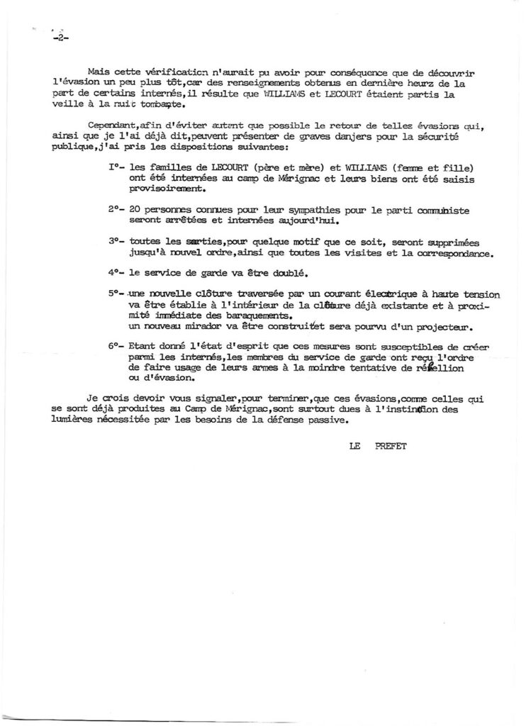 Enfin la date de ma libération avait sonné ! Hélas, en guise de libération, c’est le panier à salade qui me réceptionna à la porte de la prison. Je ne pus même pas embrasser ma mère qu’hélas je ne devais plus revoir. Je fus donc conduit au camp d’internement de Mérignac. J’étai devenu pour l’Etat français  » un individu dangereux classé dans la 1ère catégorie définie par la circulaire ministérielle du 5 Février 1941. Ce jour là, commença ma vie d’interné !