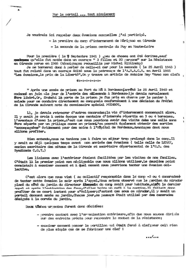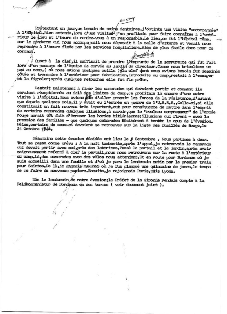 J’y retrouvais quelques camarades : des jeunes et des moins jeunes. À quoi penser, quand on est privé de liberté, entouré de barbelés ? À s’évader, pour reprendre le combat. Dès lors, avec quelques camarades nous préparâmes celle-ci. Evasion qui devait réussir le 9 septembre 1941, avec un de mes camarades. Près de 5 mois pour la préparation de celle-ci !