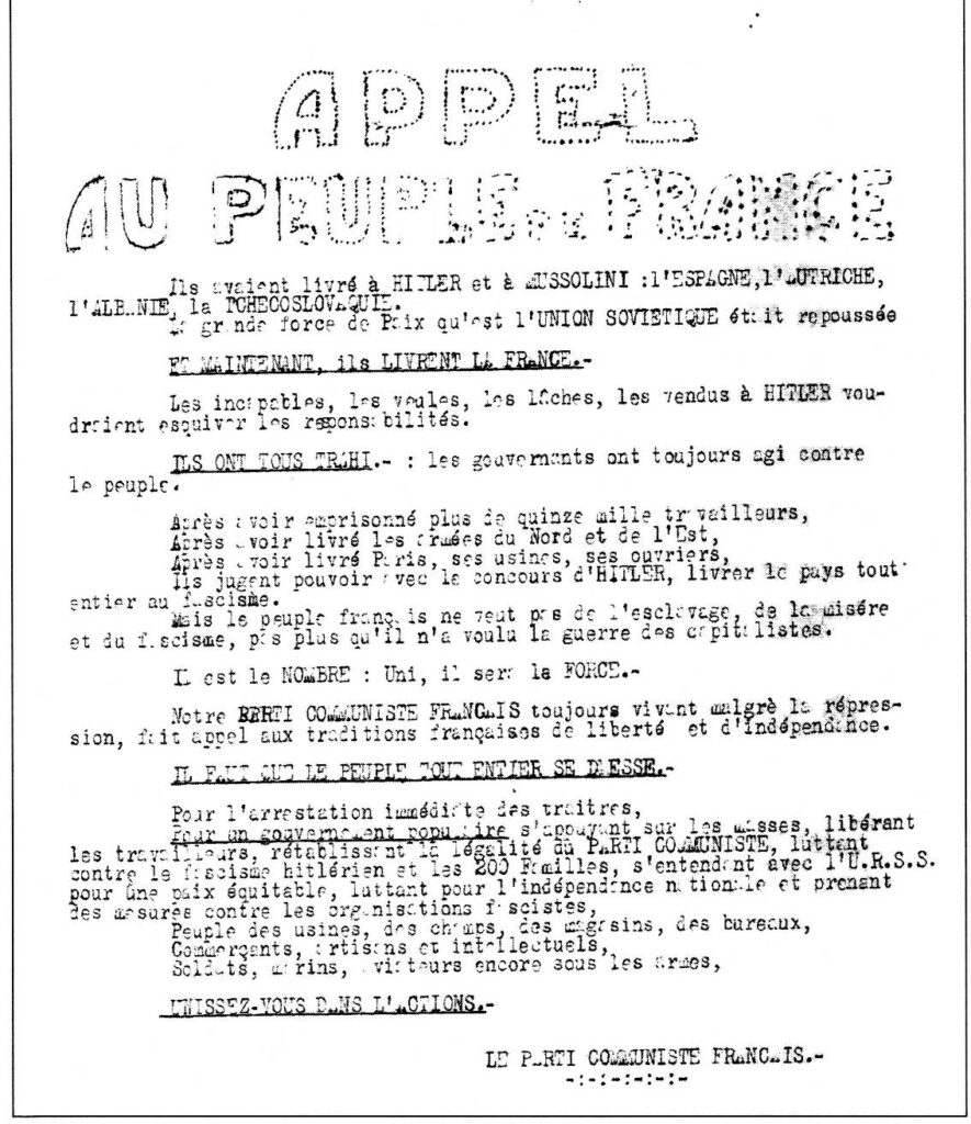 Dans les faits, si les communistes français considéraient encore l’URSS comme un allié utile à la cause de la libération et de la paix, c’est en poursuivant leur engagement auprès des Républicains espagnols contre la montée du fascisme et du nazisme tout comme ils luttaient contre l’extrême droite française qui allait accompagner Pétain et son pouvoir collaborationniste qu’ils sont entrés tôt en résistance, dans les conditions difficiles de la clandestinité et le plus souvent sous des formes de propagande…