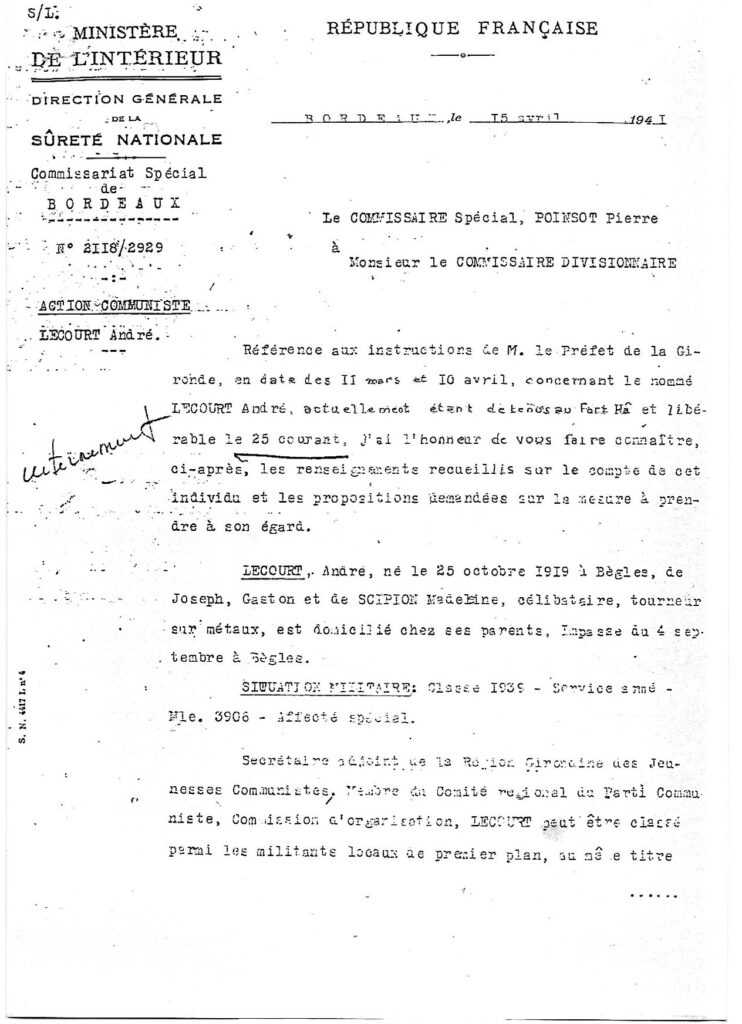Bien entendu, la police ne resta pas inactive : le 25 avril 1940, j’étais arrêté. J’avais 20 ans et demi. Condamné à un an de prison pour reconstitution d’organisation dissoute. Je connus la prison du Fort du Hâ -à Bordeaux. Durant mon séjour, en juin ma mère reçut ma feuille de route : je devais rejoindre l’armée appartenant au 3ème contingent de la classe 39/3 à Toulouse où j’étais affecté. Présentant ma feuille de route au directeur de la prison, celui-ci me fit cette réponse : « Nous n’avons pas besoin de soldat comme toi.” Je restais donc incarcéré au Fort du Hâ ! Quelques jours plus tard, les Allemands occupaient Bordeaux. J’y finis donc ma peine.