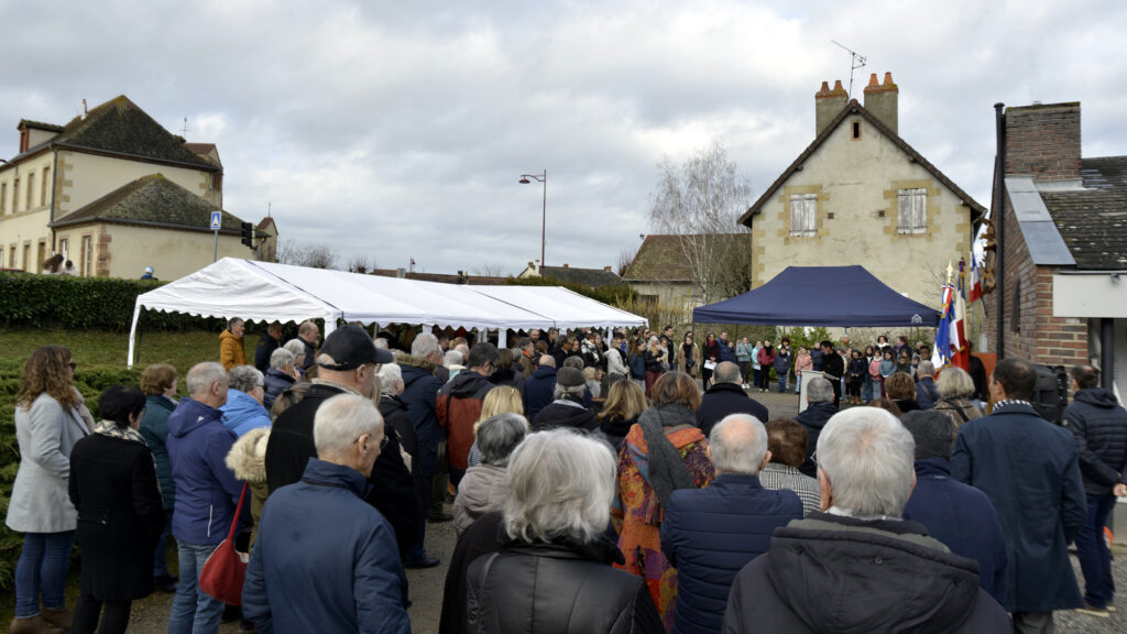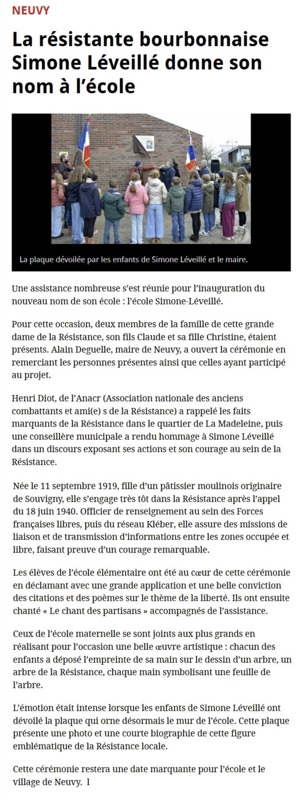 La matinée de samedi était quant à elle consacrée à la cérémonie de dénomination, dévoilement de la plaque avec les enfants de Simone Léveillé, les enfants de l’école et leurs enseignantes, la municipalité et la population nombreuse a avoir répondu à l’invitation. Les prises de parole de la municipalité ont retracé l’histoire du projet et pour l’ANACR Henri Diot a fait dialoguer la mémoire de Marguerite FAUVERGUE (une autre résistante moulinoise) avec celle se Simone LEVEILLE avant que la plaque ne soit dévoilée des mains jointes des enfants de Simone et du maire de Neuvy.